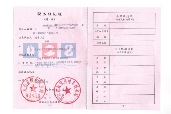 028廣告公司企業稅務登記證書